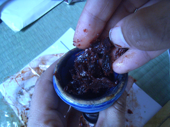 , シーシャフレーバの葉を指で揉み解します。 2 の写真で揉み解す前と後の量の変化を見てください。一度に使うタバコの量は、使うパイプによって違いますが、トルコやシリア製のものは大体 50 グラムの箱で1 /4 ~ 1/6 、イラン製のものは 1/2~1/3 ほどが目安です。ヘッドの大きさによります。 1.